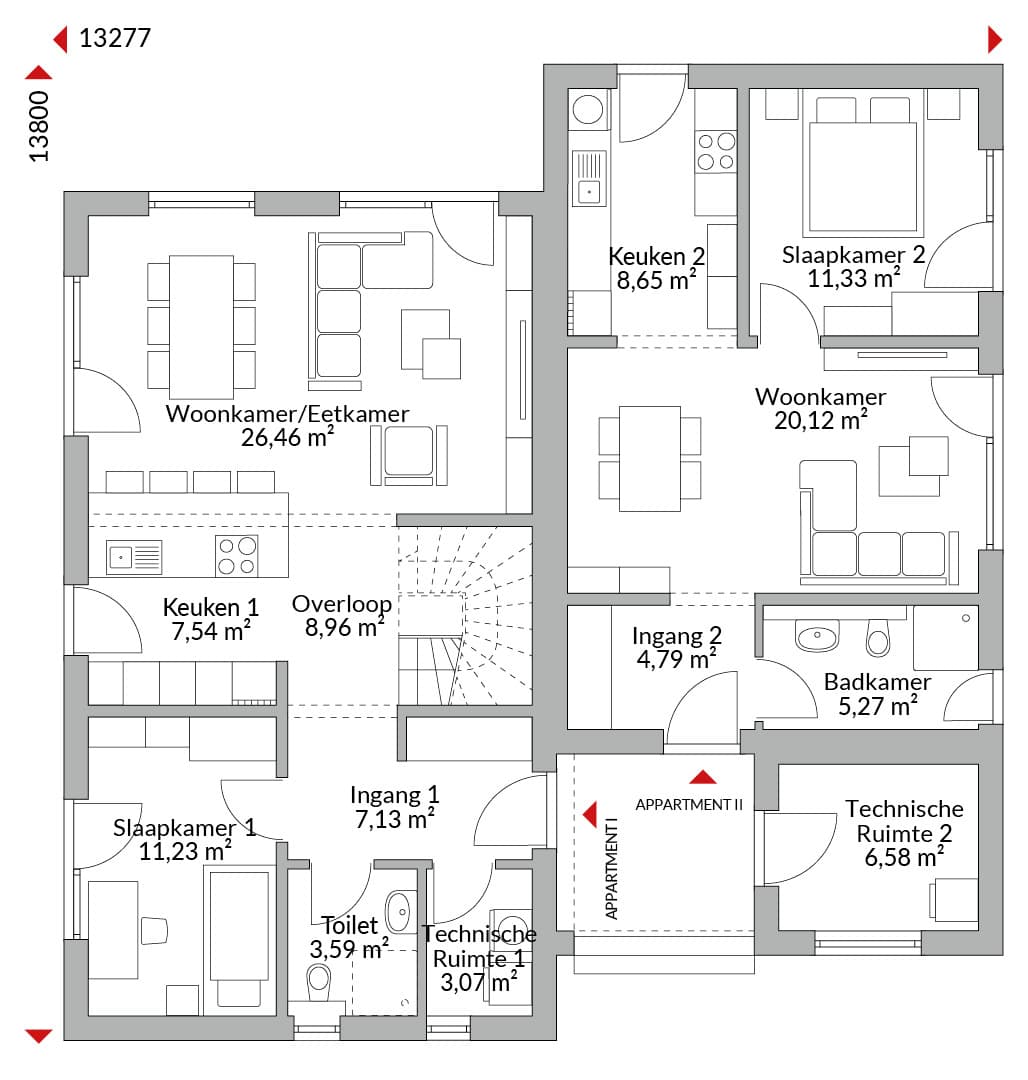 Gezamenlijke technische ruimte met aparte externe toegang voor beide appartementen.