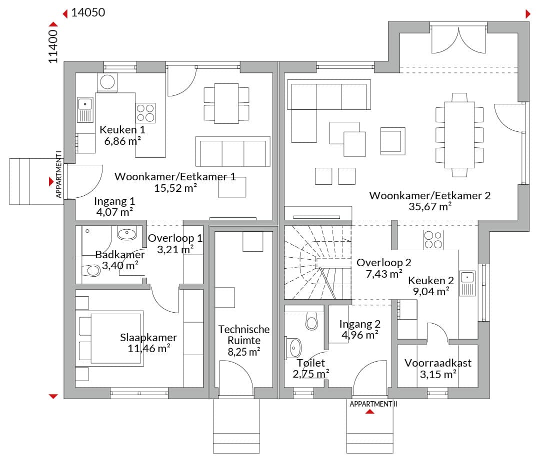 Anderhalf verdiepingen tellend huis met twee appartementen en aparte ingangen. Gezamenlijke technische ruimte met aparte externe toegang voor beide appartementen. Zadeldak met een dakhelling van 30°. Knieschothoogte: 1,50 m.