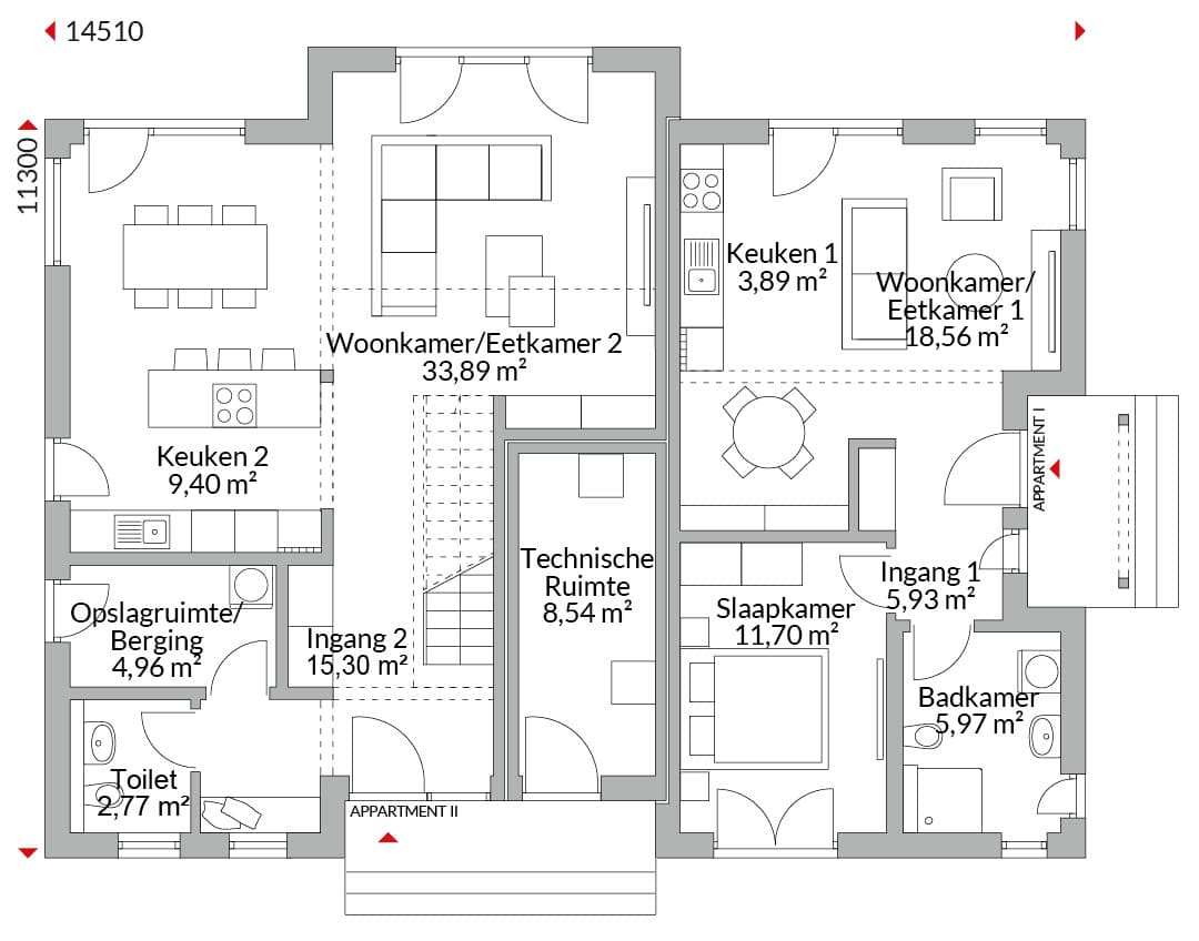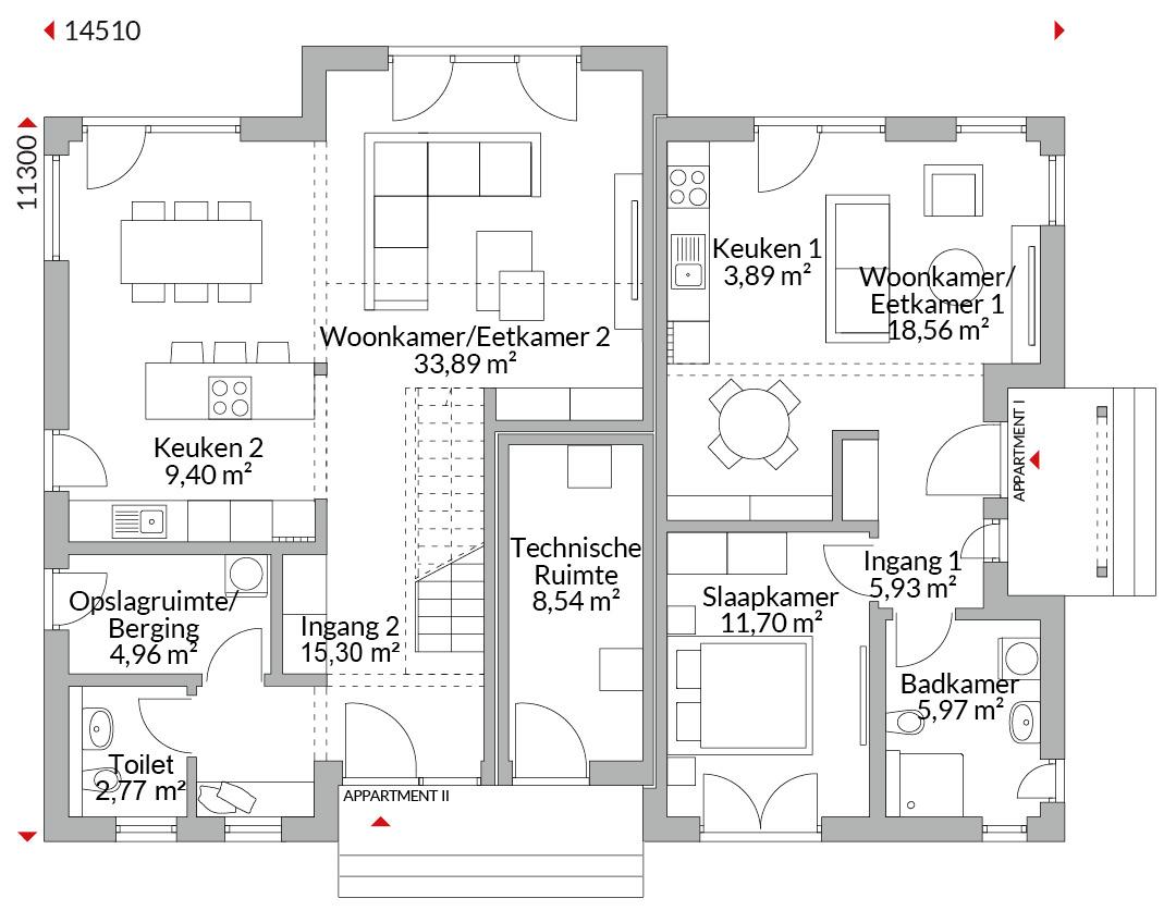 Anderhalf verdiepingen tellend herenhuis met twee appartementen en aparte ingangen. Gezamenlijke technische ruimte met aparte externe toegang voor beide appartementen. Schilddak met een dakhelling van 20°.
