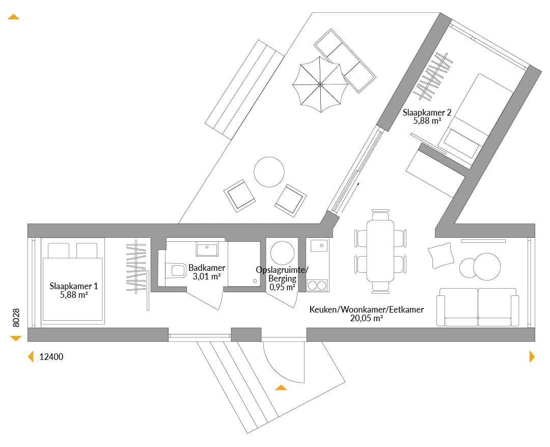 Groter gezelschap? Het mooie van modulaire woningen is dat je extra kamers kunt toevoegen als dat nodig is – bijvoorbeeld een tweede slaapkamer en een grote kledingkast – want met vier personen, of zelfs maximaal zes, heb je nu eenmaal wat meer leef- en opbergruimte nodig. En ondanks de smalle S-modules is er nog steeds ruimte voor een grote tafel waar je samen kunt eten en spelletjes spelen. De toevoeging van de zijvleugel zorgt bovendien voor een windbeschut terras - een vaste plek, net zo comfortabel als een serre.