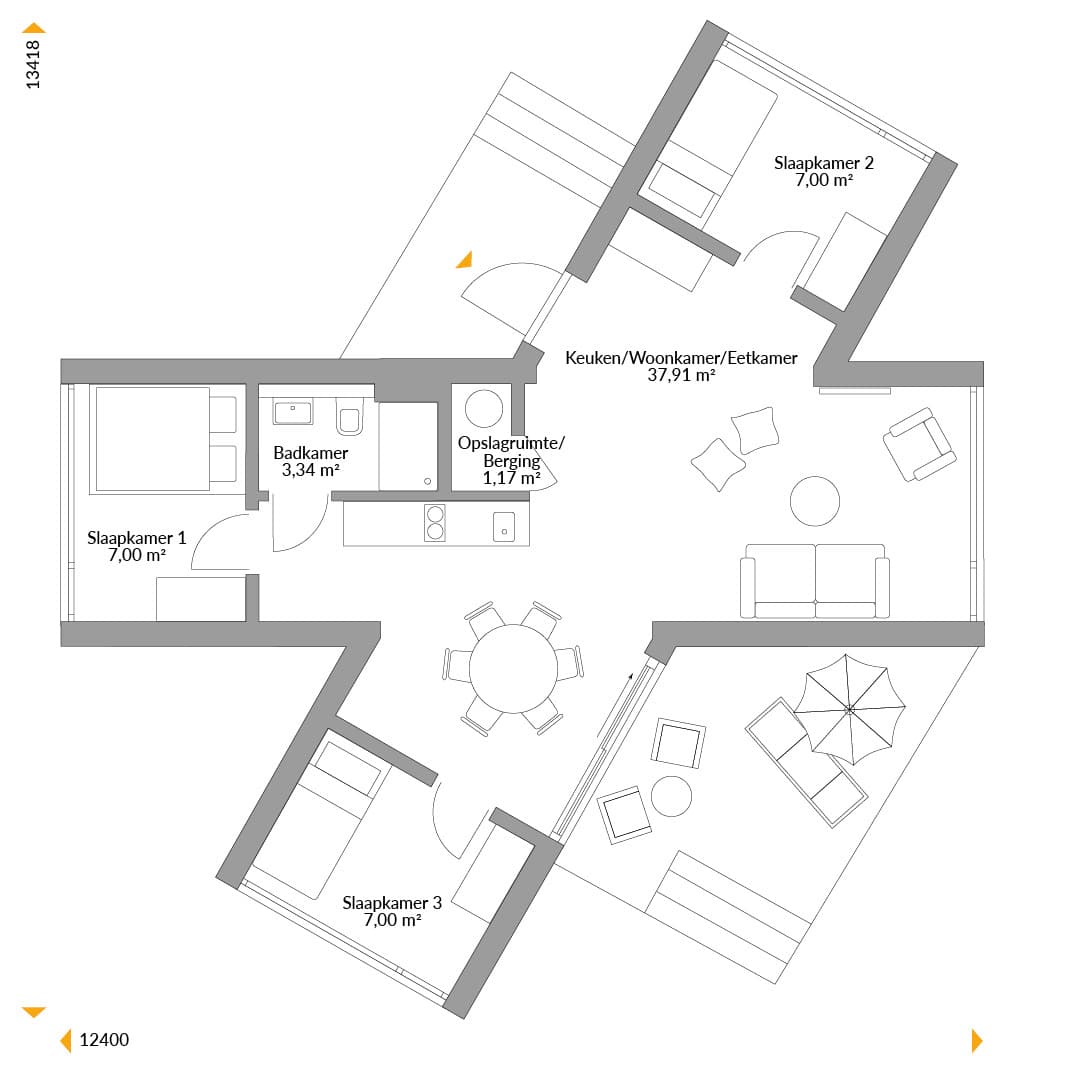Vakantie met vrienden: Met 63 m² is dit vakantiehuis ons grootste NEXT Holiday woning. Gebouwd uit L-modules en met twee zijvleugels, biedt het drie slaapkamers en een ruime, lichtovergoten gezamenlijke ruimte met een lounge en een aparte eetkamer. De kitchenette heeft alles wat je nodig hebt voor zelfvoorzienend verblijf, en de moderne badkamer is echt luxe. Vijf volledig glazen panoramawanden brengen de omliggende natuur rechtstreeks naar binnen en zorgen, samen met het windvrije terras, voor een fantastisch vakantiehuis.